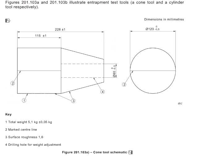 卡陷试验工具符合 IEC60601-2-52:2009 图 201.103a,重5,1kg± 0,05kg。